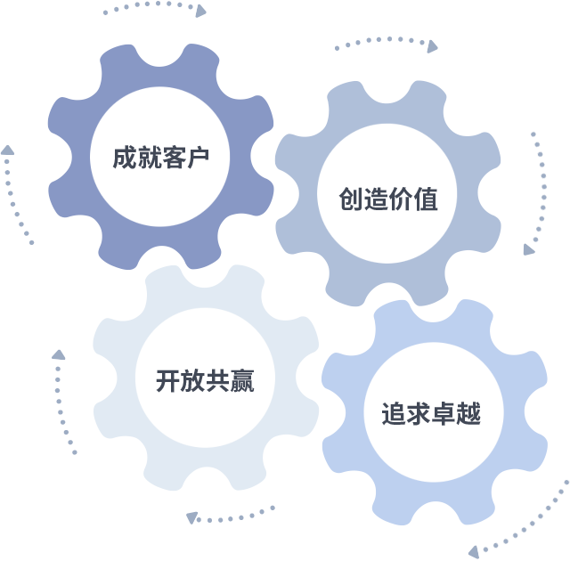 成就客户是一切决策的出发点,,,创造价值是衡量所有工作的标准,,,,追求卓越是我们做事做人的态度,,,开放共赢是我们的格局也是最终的结果。。。价值观的齿轮环环相扣,,,推动着组织里的每个人不断向前。。